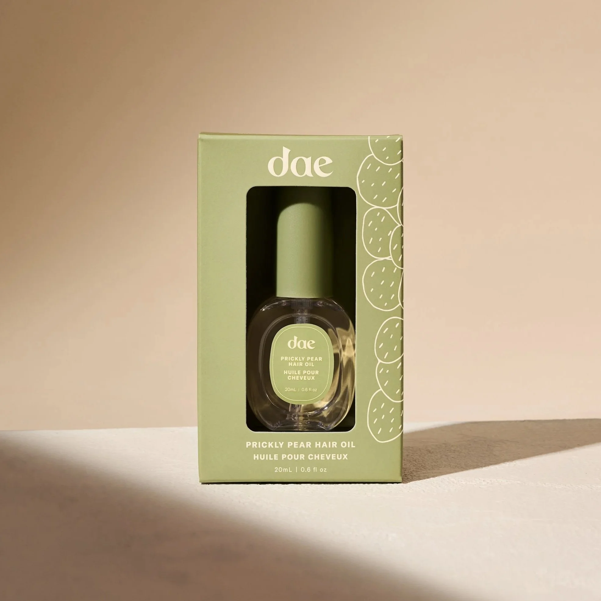 Various Dae brand hair and styling products, including dry shampoo, styling mist, and hair oil, on a white surface with some droplets of water.